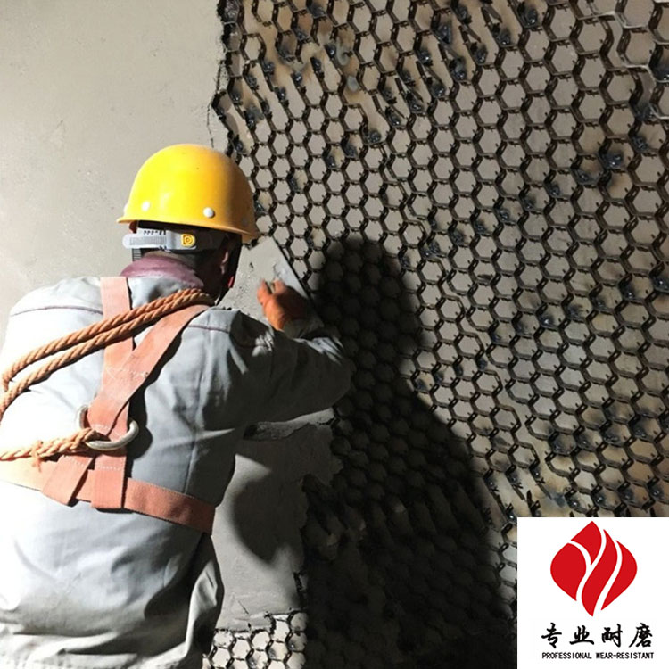 5.涂抹;操作人员需配备劳保手套、口罩、眼镜及防护帽等防护用品,如果在高空作业需要佩戴合格的防护带,从桶内取出适量耐磨料(每次约两公斤为宜),需用力涂抹在焊接好的龟甲网上,保证不能有空洞或压不实的现象,以保证耐磨陶瓷涂料紧密的和龟甲网及钢板结合在一起,垂直面和顶部需一次成型,不能分层涂抹,以防止出现起层现象。