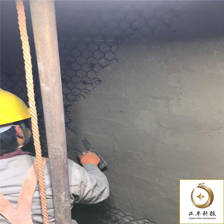 5. 涂抹;操作人员需配备劳保手套、口罩、眼镜及保护帽等防护用品,如果在高空作业需要佩戴合格的带,从桶内取出适量陶瓷涂料(每次约两公斤为宜),需用力涂抹在焊接好的龟甲网上,保证不能有空洞或压不实的现象,以保证耐磨陶瓷涂料紧密的和龟甲网及钢板结合在一起,垂直面和顶部需一次成型,不能分层涂抹,以防止出现起层现象。