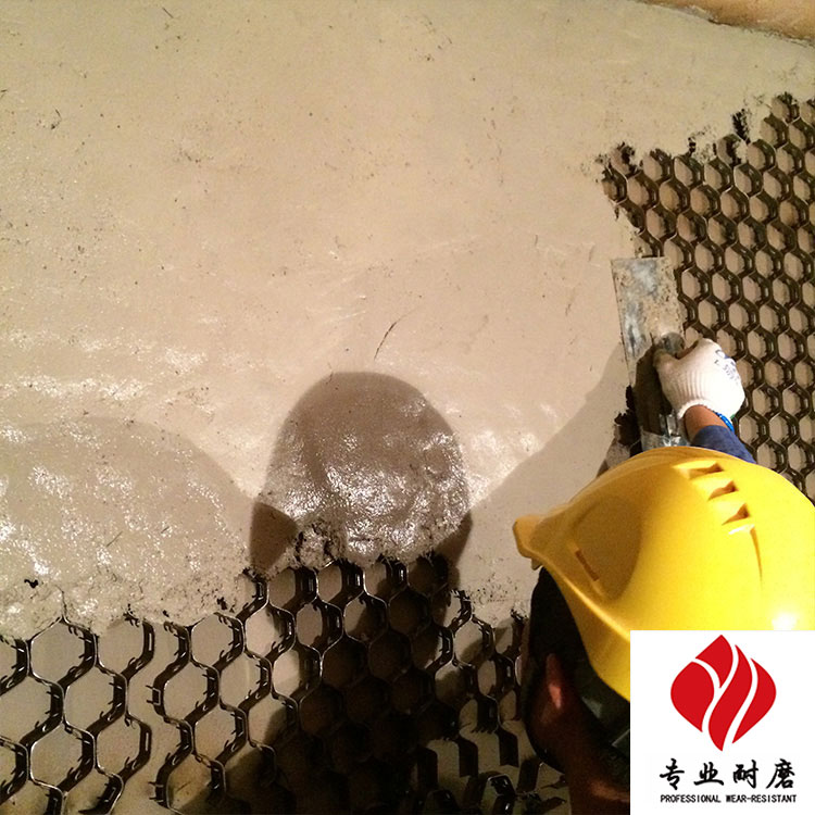 5.涂抹;操作人员需配备劳保手套、口罩、眼镜及防护帽等防护用品,如果在高空作业需要佩戴合格的防护带,从桶内取出适量耐磨料(每次约两公斤为宜),需用力涂抹在焊接好的龟甲网上,保证不能有空洞或压不实的现象,以保证耐磨陶瓷涂料紧密的和龟甲网及钢板结合在一起,垂直面和顶部需一次成型,不能分层涂抹,以防止出现起层现象。